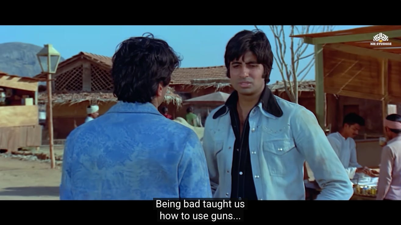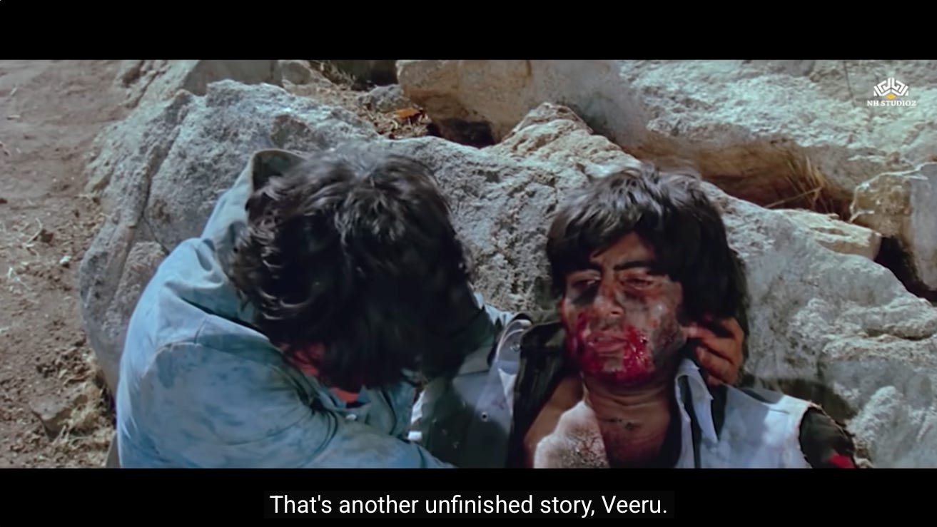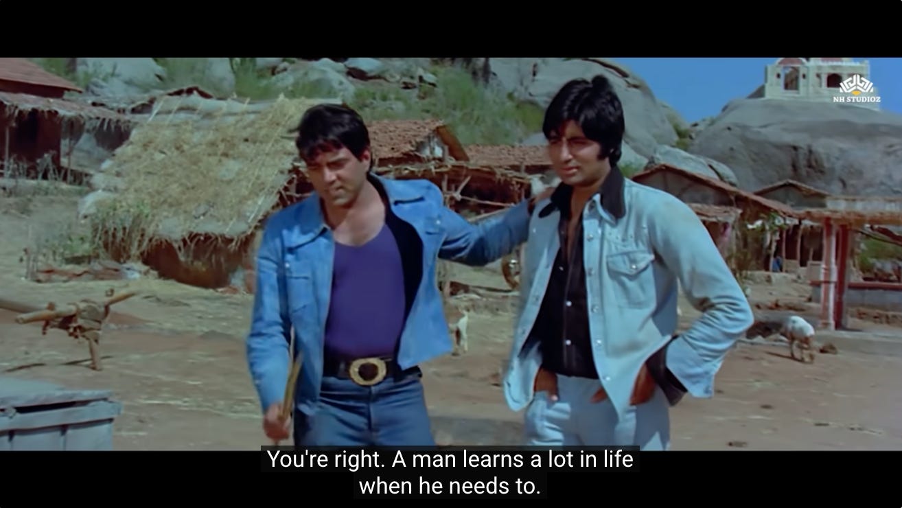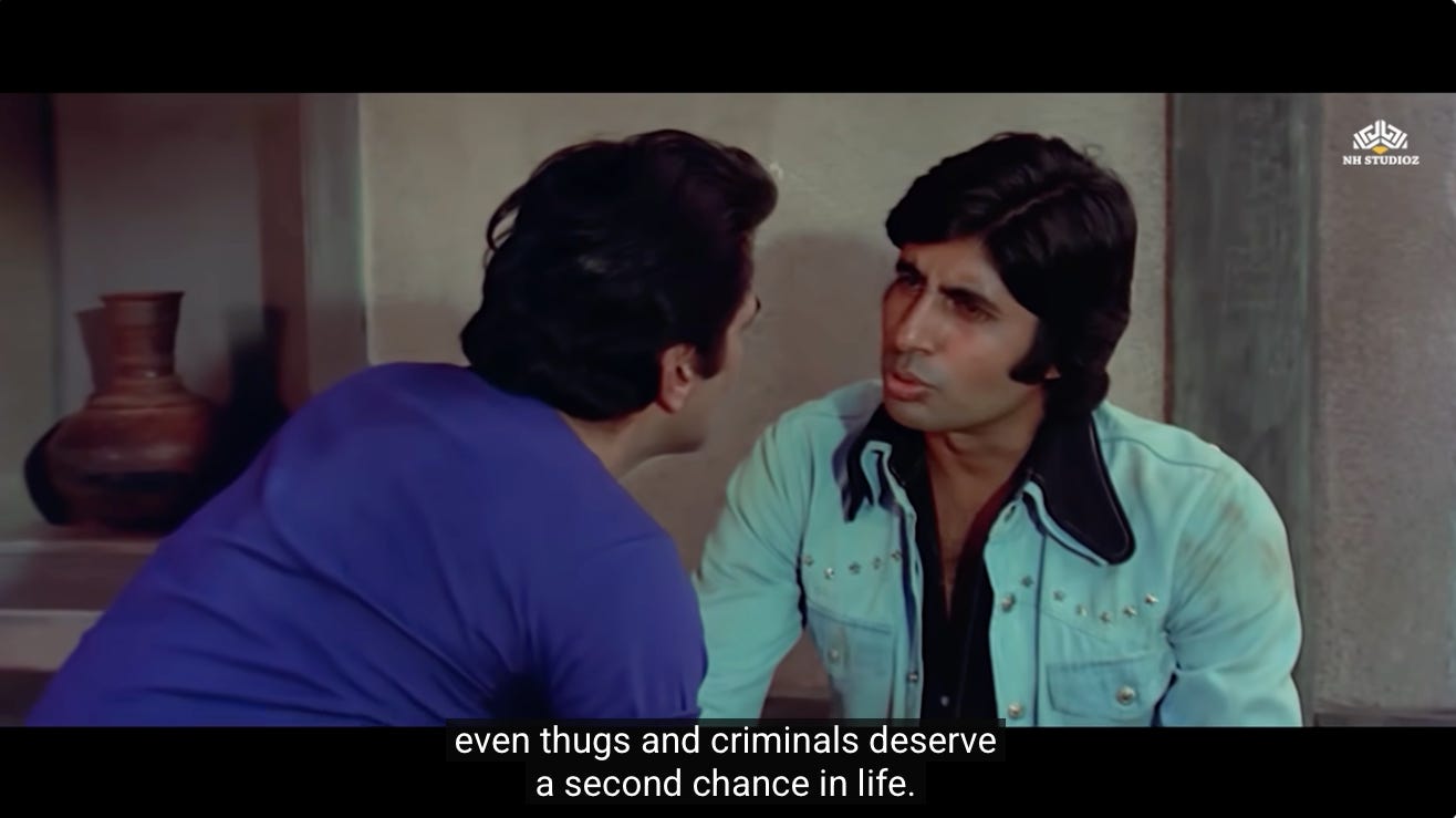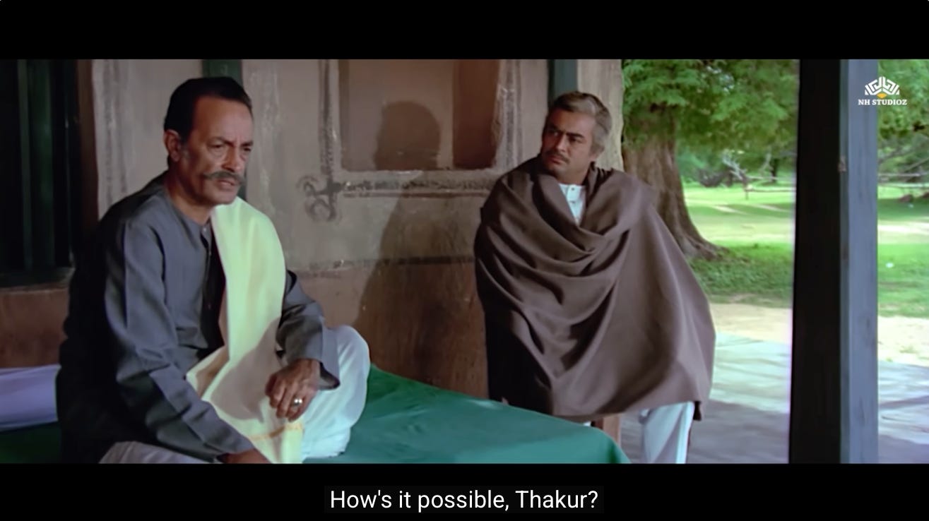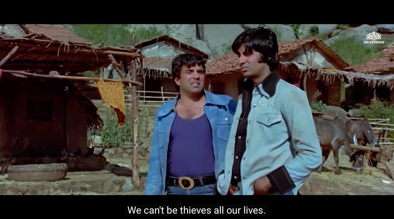 This is the first moment where we see a shift in Jai and Veeru, and their decision to not go back to being petty thieves. Perhaps they realize that Thakur’s assignment represents the second chance they were never given.