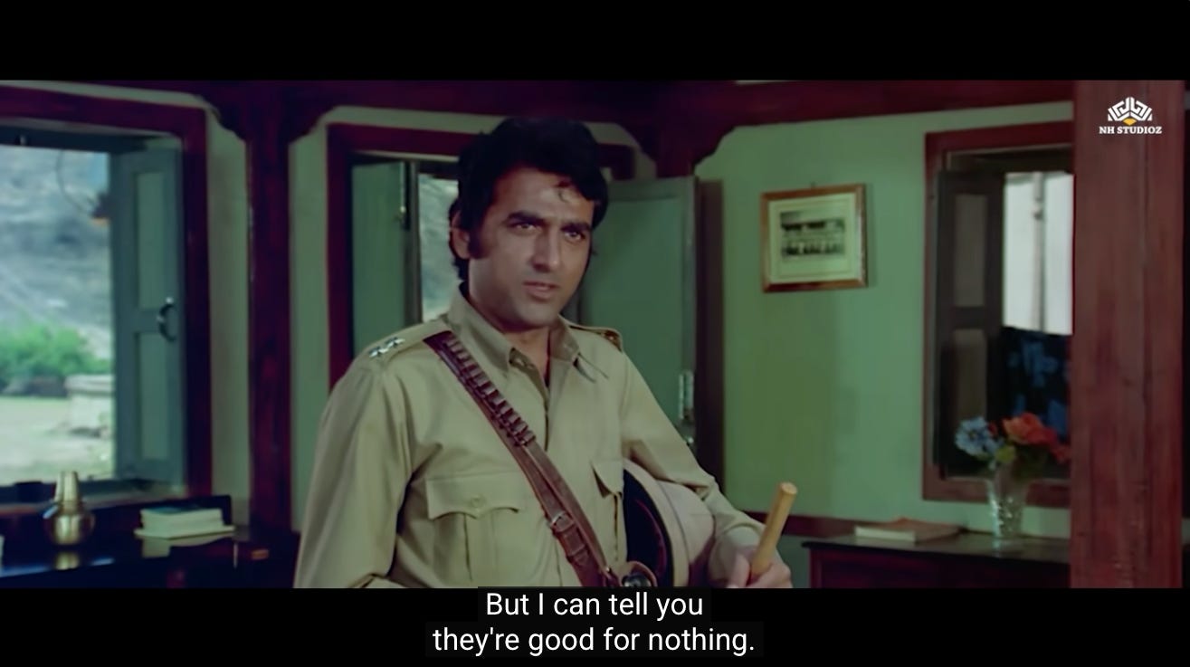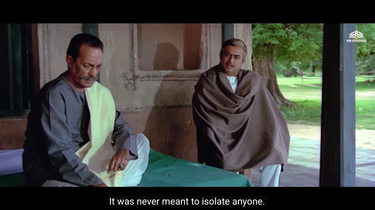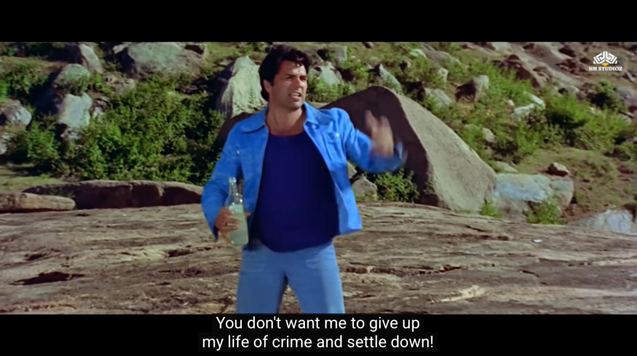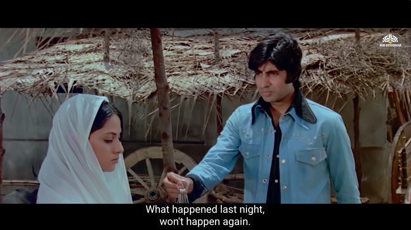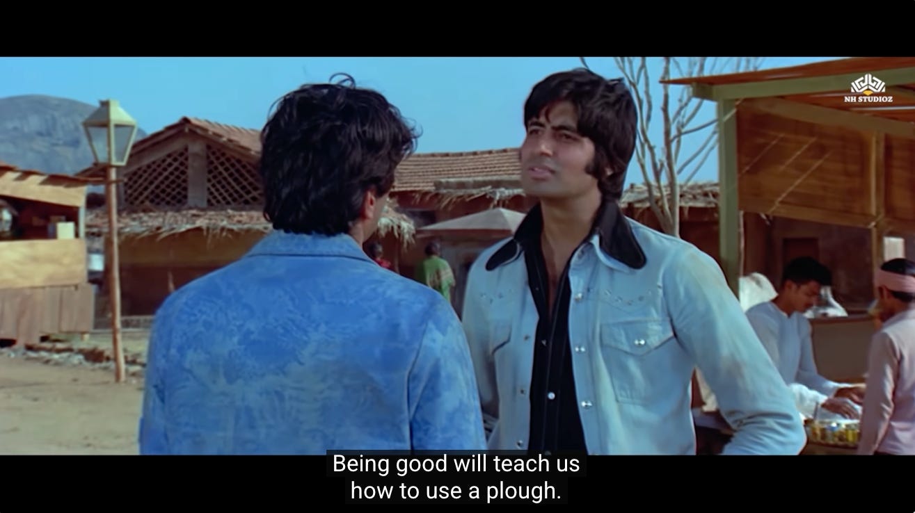 This is the first moment where we see a shift in Jai and Veeru, and their decision to not go back to being petty thieves. Perhaps they realize that Thakur’s assignment represents the second chance they were never given.