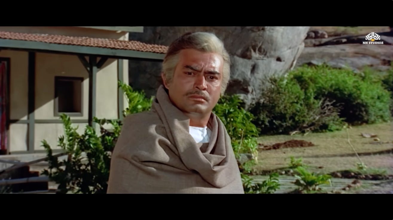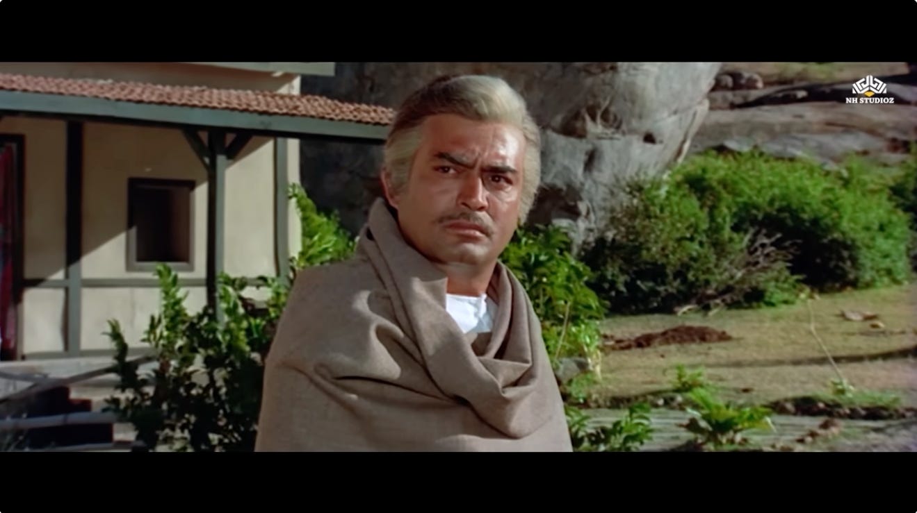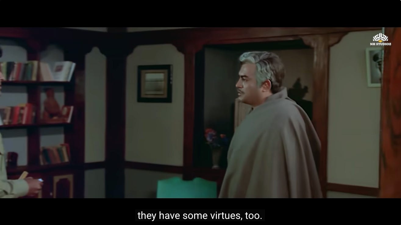 The very next scene shows Thakur in conversation with Radha’s father, Inspector Khurana (Iftekhar), discussing the prospect of rehabilitating Radha by arranging her marriage with Jai.