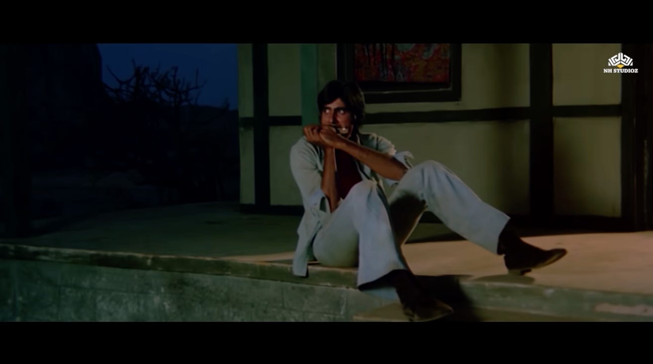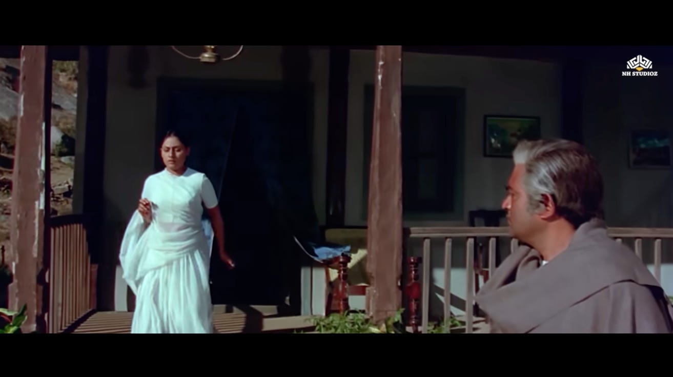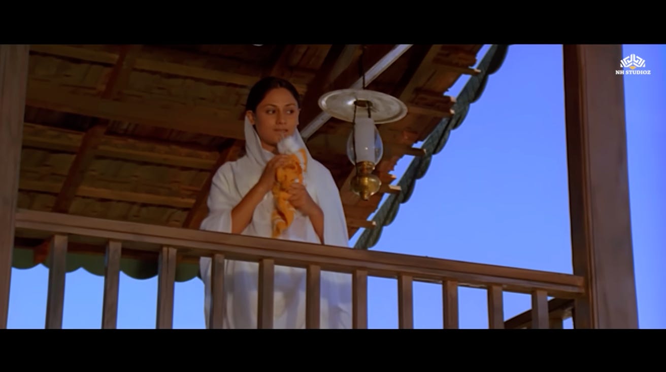 The scene of Radha turning the lights out in the courtyard and Jai playing on his harmonica is repeated again, with similar chemistry between them. However, Radha seems to have resigned herself to her fate of a lonely life.