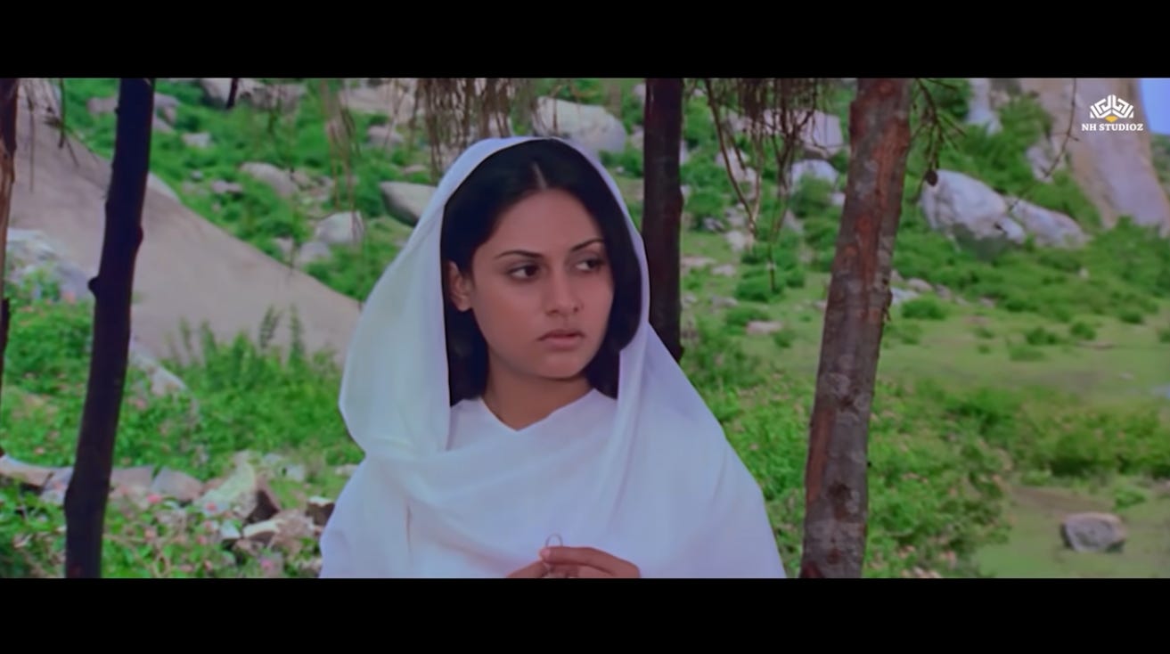 Fast forward to the gunfight with Gabbar’s dacoits where Jai gets fatally wounded. As he is lying in Veeru’s arms, Radha rushes to the scene along with Thakur and villagers, anxiety writ large over her face, worried that her second chance will not materialize.