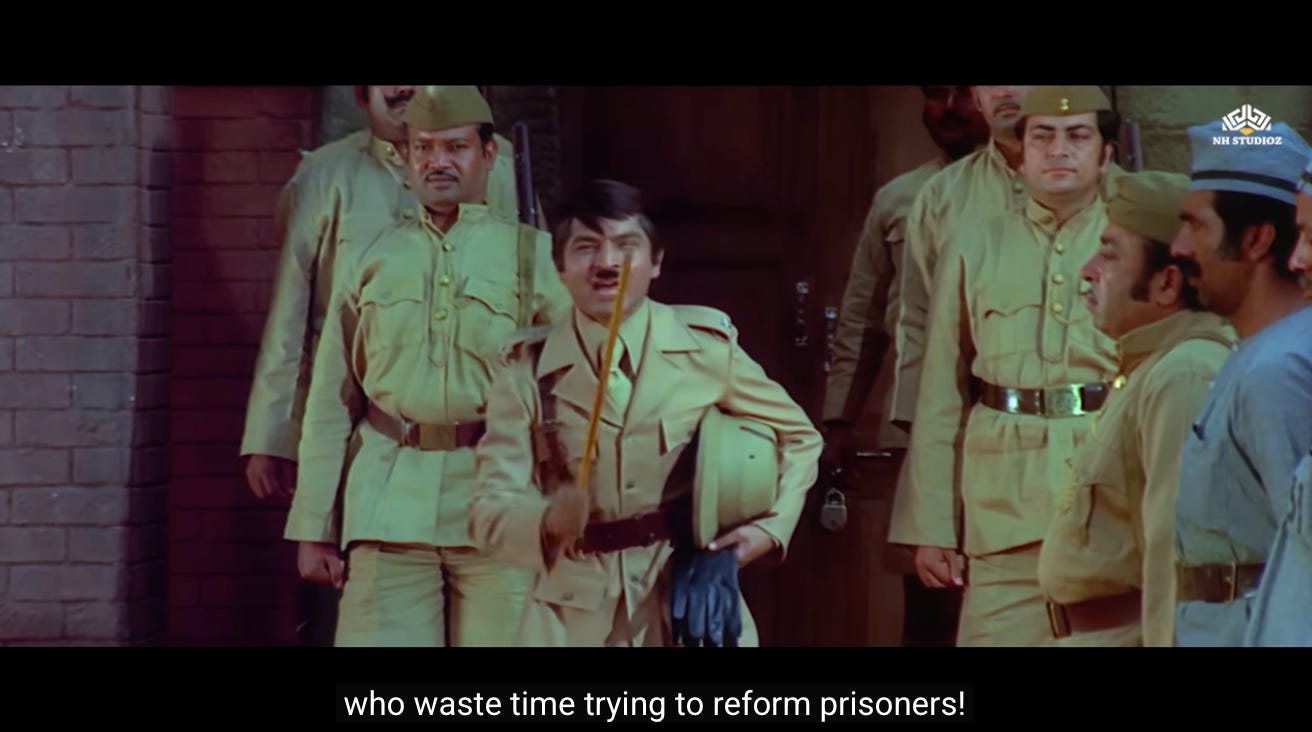 In this scene, Jai and Veeru have been caught by the police and put in jail. The jailer-in-charge (Asrani) touts himself as a British-era jailer, who is not like today’s jailers who waste time trying to reform prisoners.