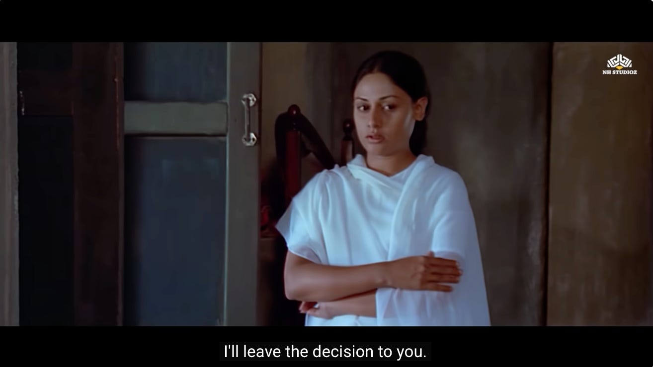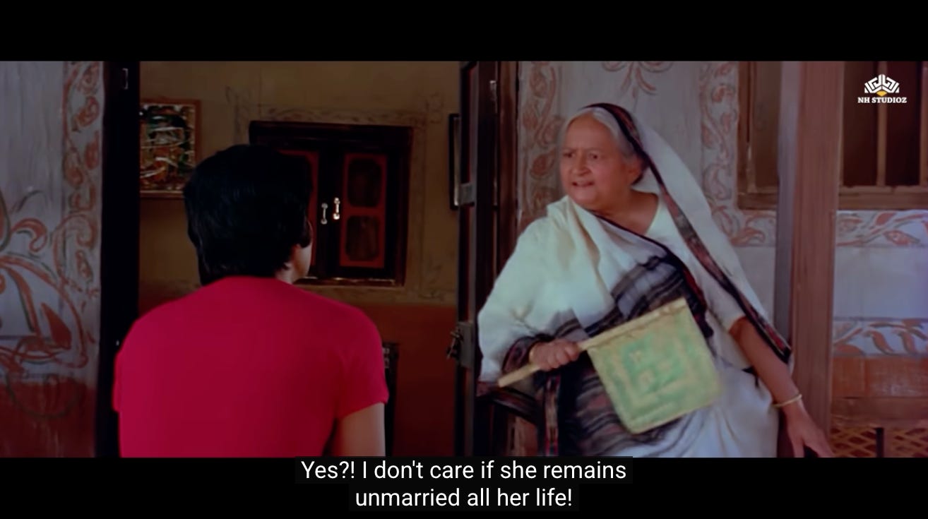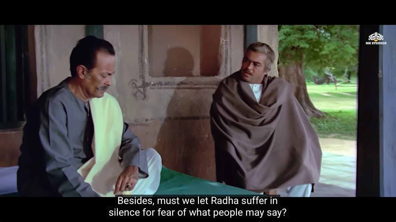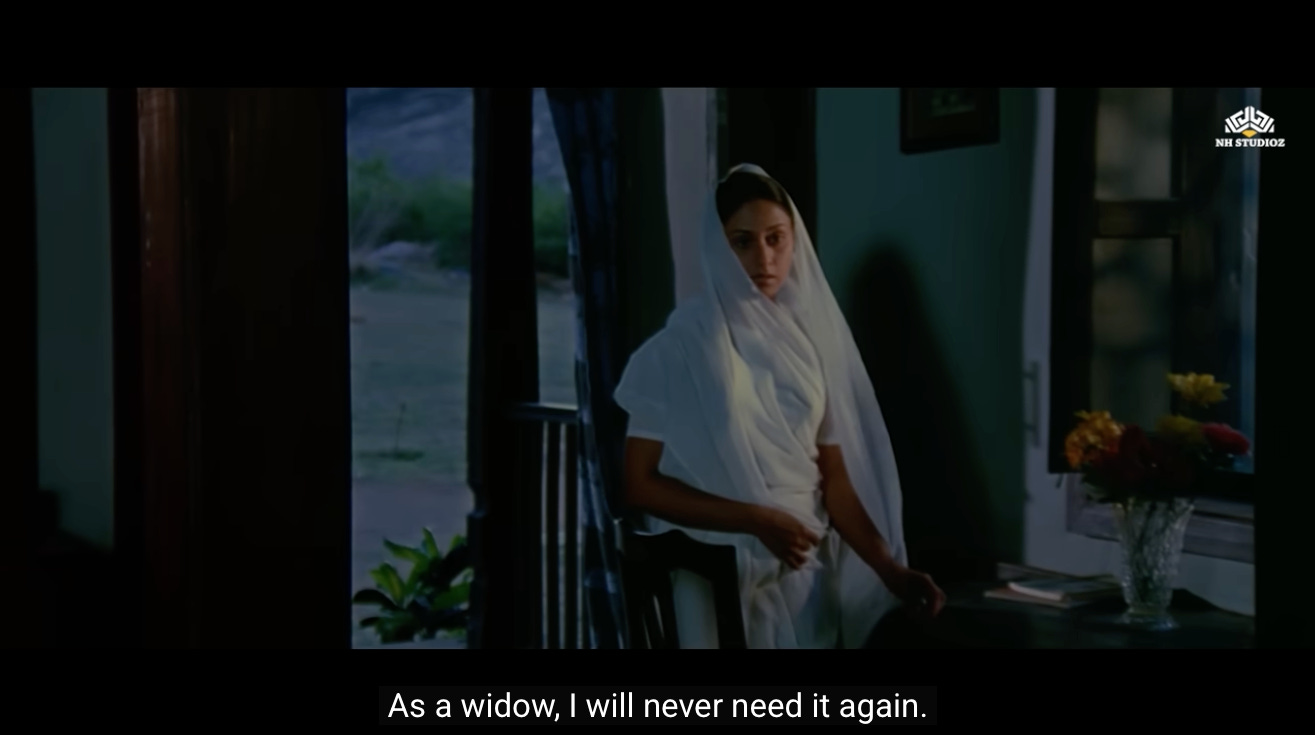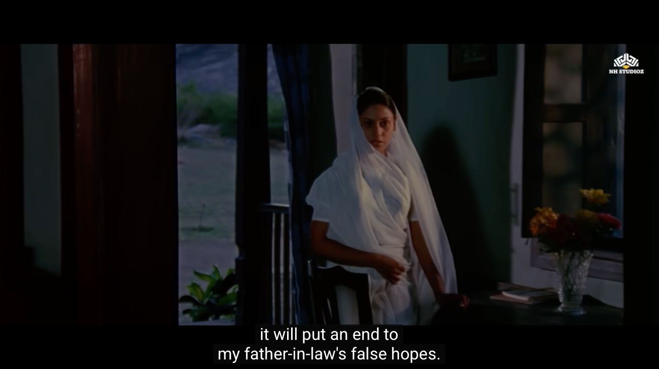 As both elders agree to the marriage, the camera pans back to Radha. She has an expression of quiet relief and prospect for her new life to have some meaning. She is also aware of the monumental change this is for a widow to remarry.