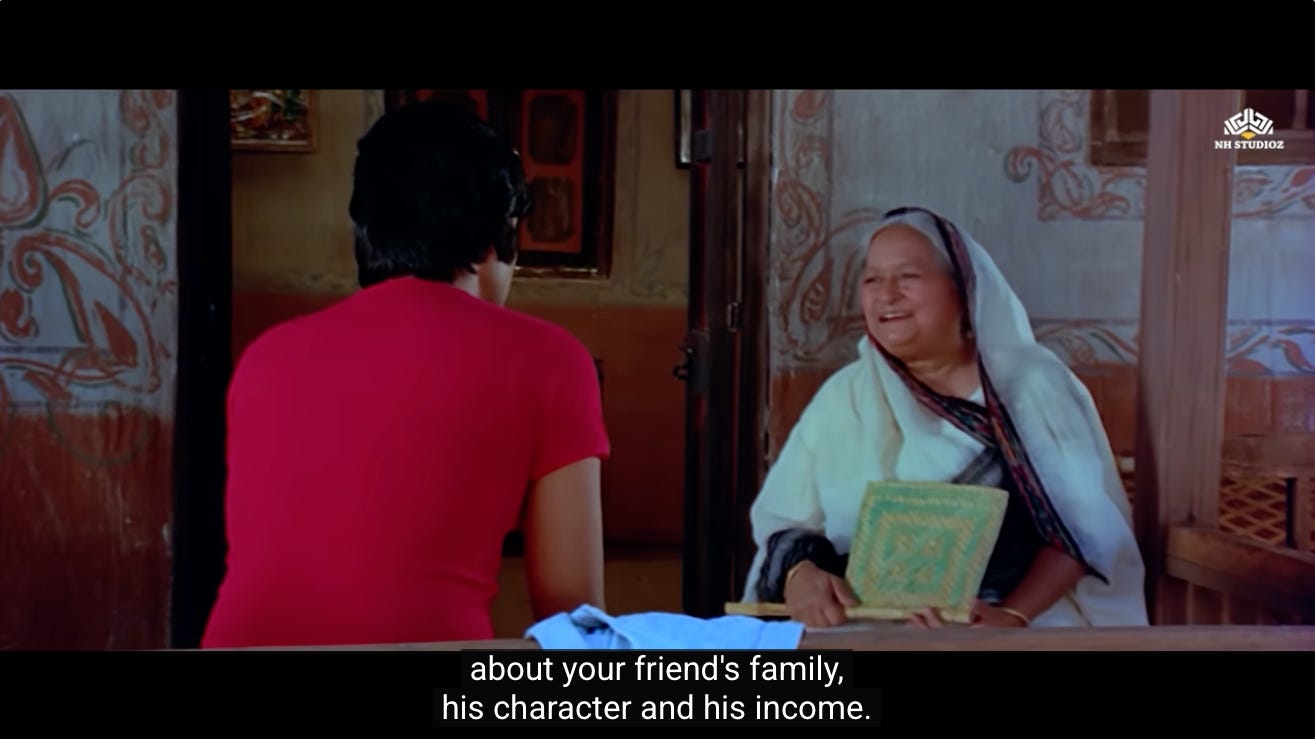 This scene is written as a comedic sequence, where Jai does his best to make sure that Mausi is aware of his friend’s reality, and it evokes much mirth.