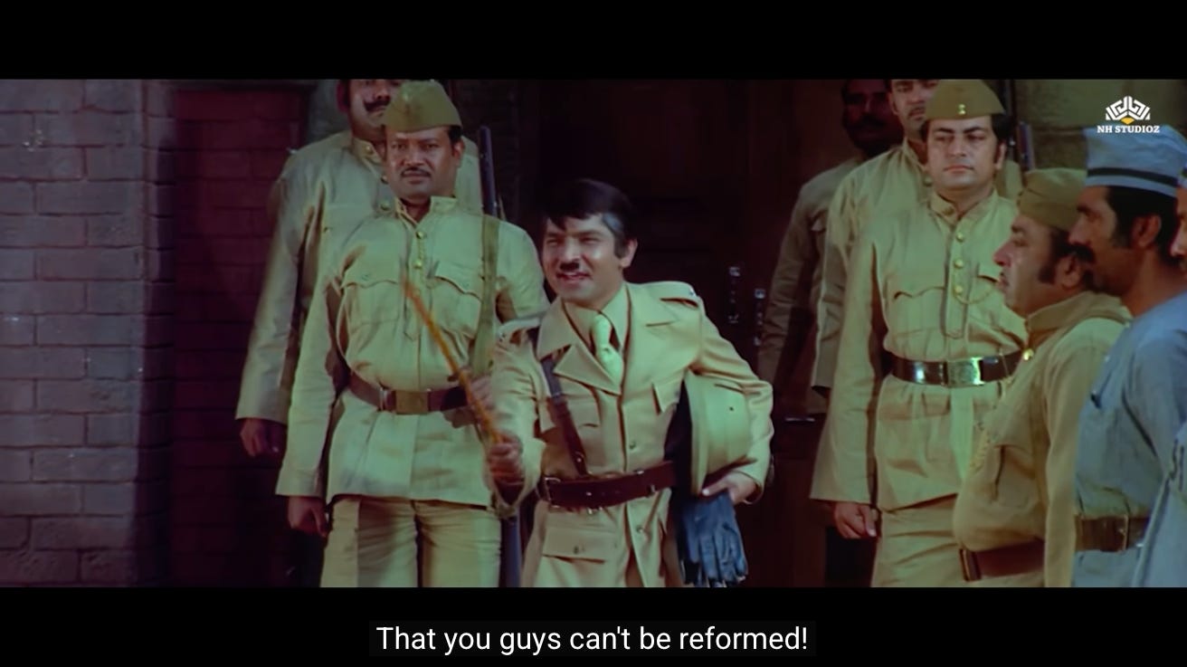 In this opening scene between the Jailer and Thakur, the Jailer represents the system that has given up on Jai and Veeru as criminals beyond repair. Thakur represents the benevolent side of us, imploring us to see the good side of everyone, even crooks.