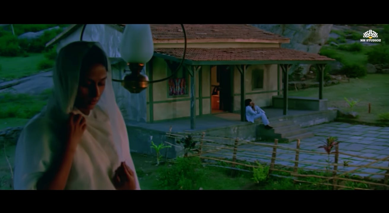 Their chemistry is further accentuated in the very next scene when Radha is turning the lights out at dusk while Jai is playing his harmonica in the courtyard.